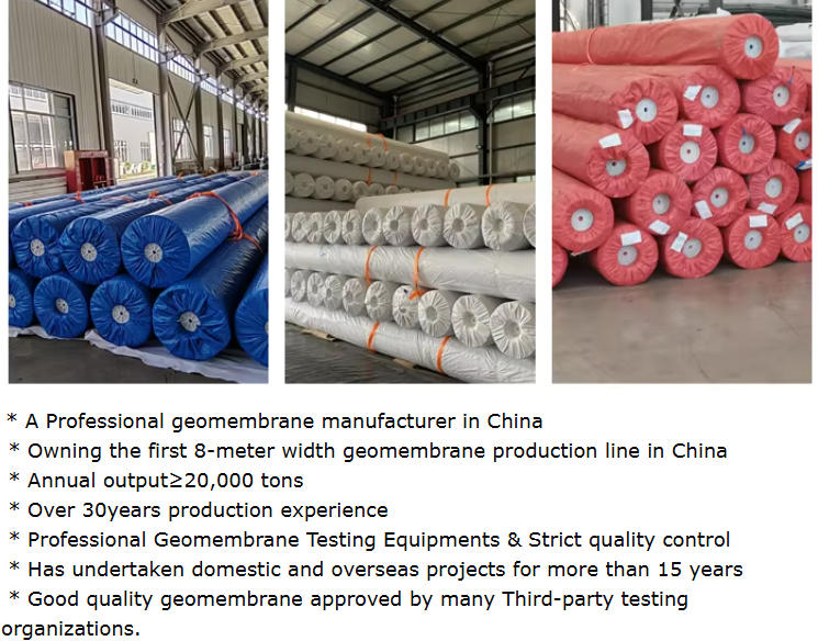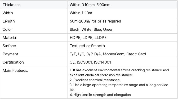 HDPE Geomembrane pond liner is a kind of smooth, high quality waterproof liner, which is made of specially formulated original polyethylene resin. This raw material is specially designed for flexible geomembrane applications. The pond liner plastic sheeting contains about 97.5% polyethylene, 2.5% carbon black and traces of antioxidants and heat stabilizers. It does not use other additives, fillers or extenders. The HDPE geomembrane pond liner plastic sheeting has excellent chemical resistance, mechanical properties, environmental stress crack resistance, dimensional stability and thermal aging characteristics. In addition, HDPE Geomembrane liner has puncture resistance and tear resistance that are unmatched by other geotechnical products on the market.